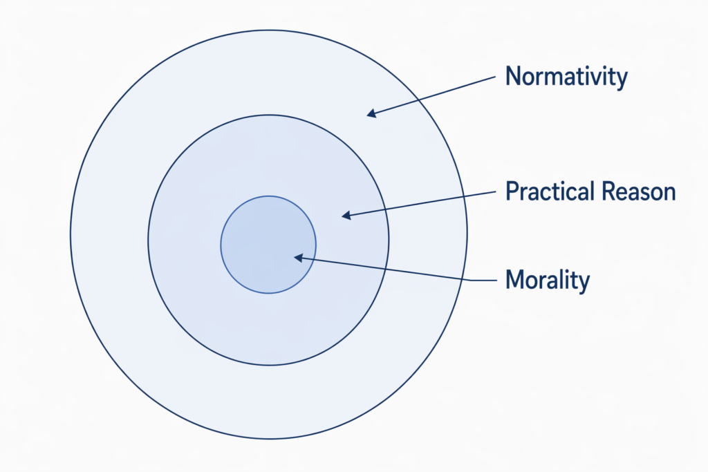 I begin by placing morality in a wider hierarchy. Normativity is the broadest category: the domain of value, oughts, and reasons. Within normativity, one major branch is practical reason, which broadly concerns choosing how to act. Morality is then a variably bounded part of practical reason, concerned especially with social rules, blameworthiness, and avoiding harm to others.